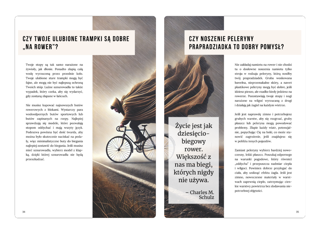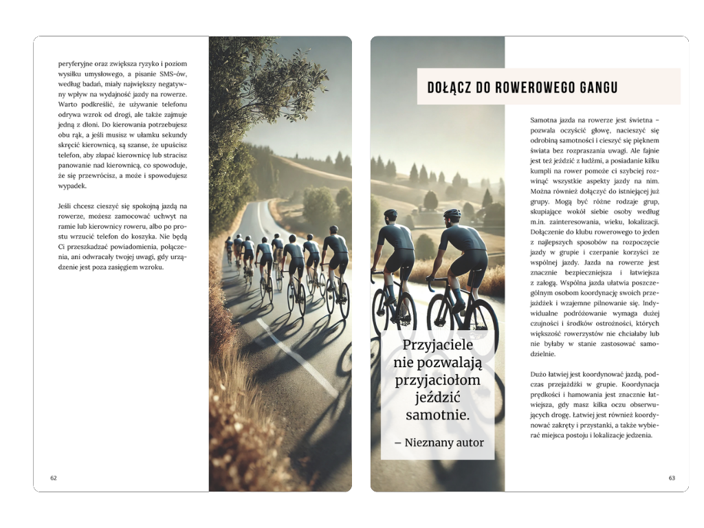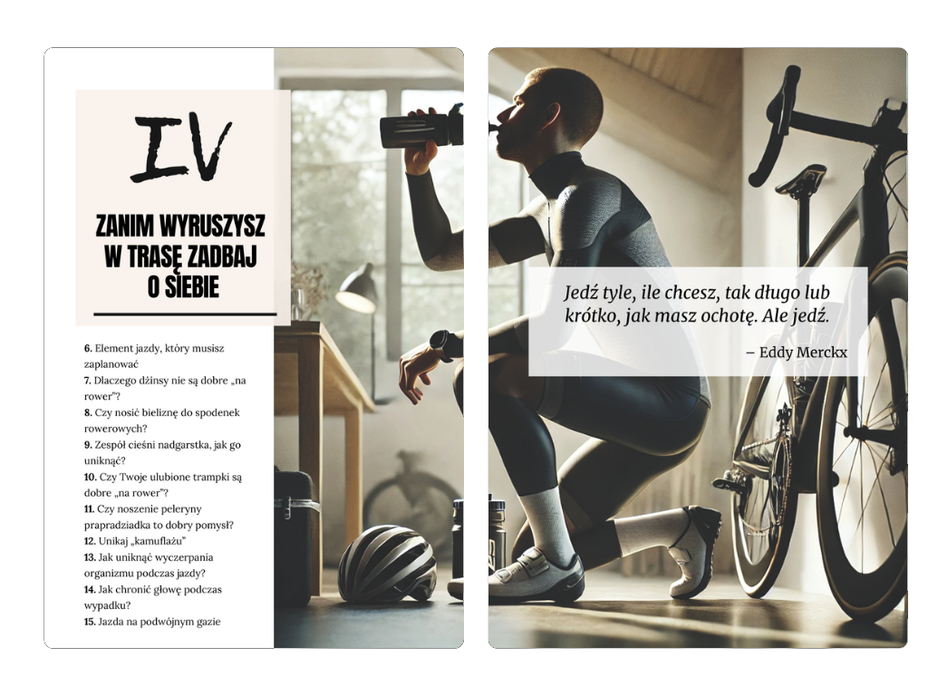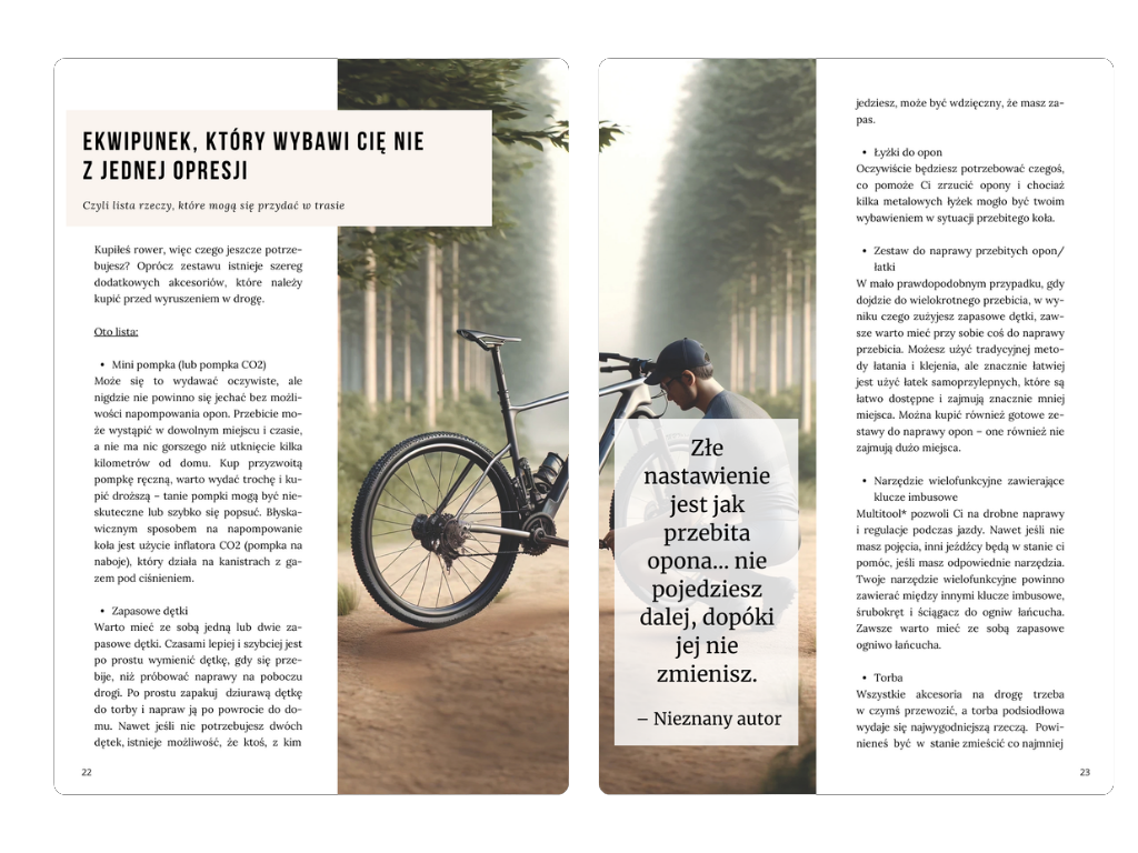 • Inwestycja w siebie – Wiedza zawarta w poradniku wzbogaci Twoje rowerowe doświadczenia i rozwinie Twoje umiejętności.