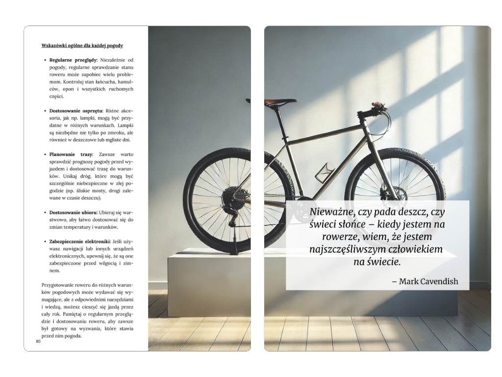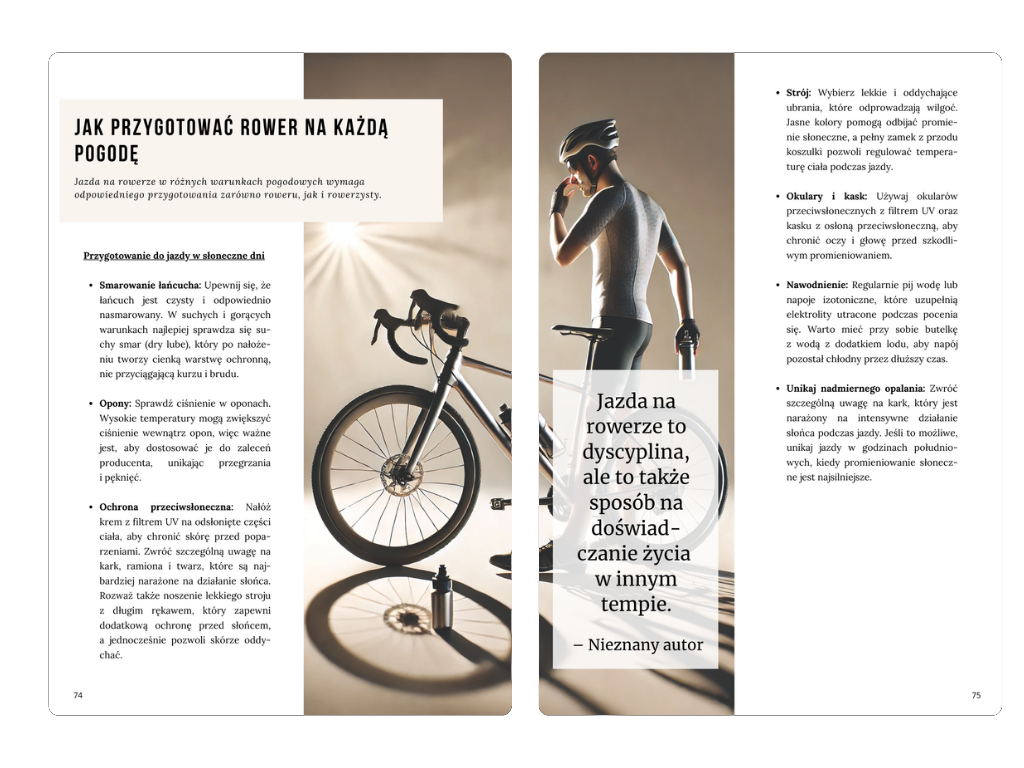 • ✅ Lepsze przygotowanie: poradnik zawiera wskazówki dotyczące konserwacji roweru, dostosowania sprzętu i radzenia sobie z różnymi warunkami pogodowymi – idealne uzupełnienie przewodnika.